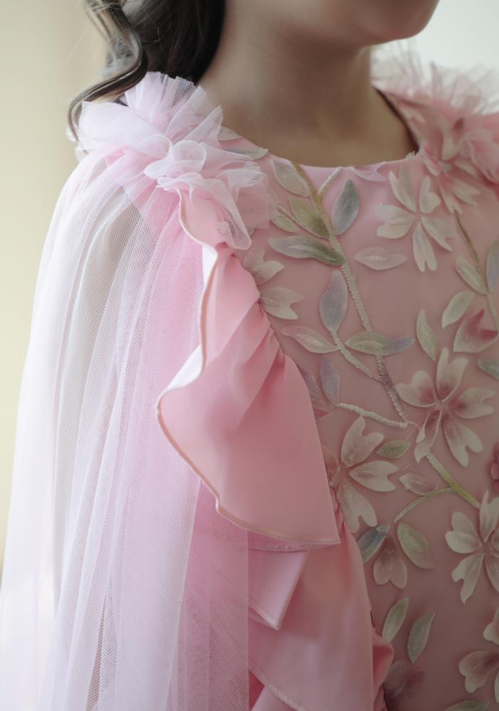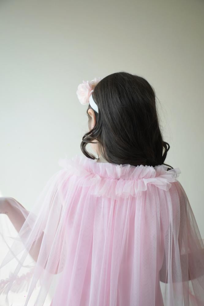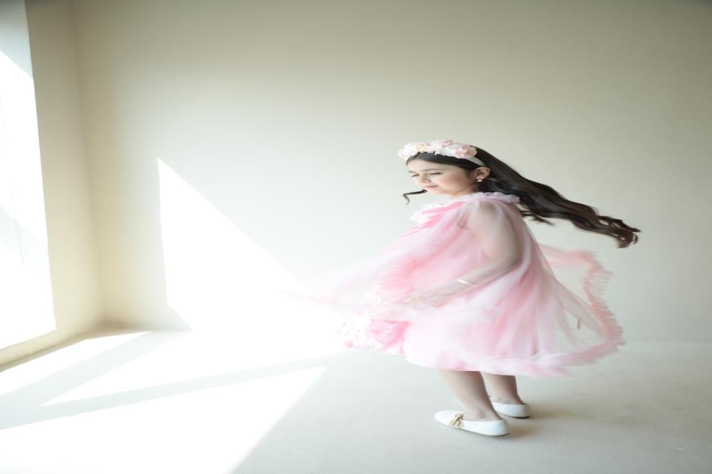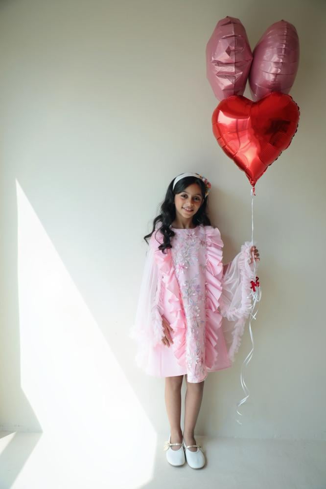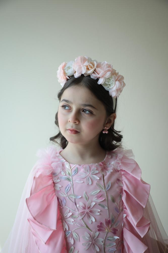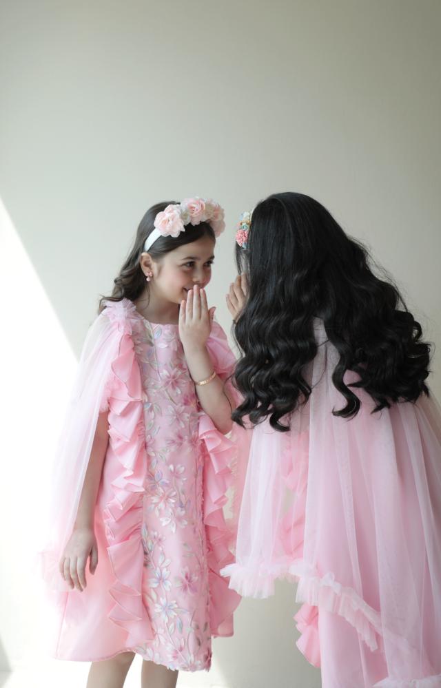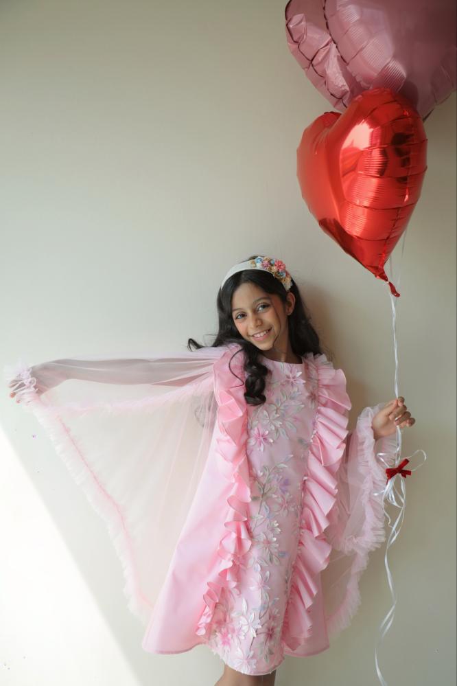 فستان يرضي ذائقة الأم و حلم الطفلة حيث يجمع بين رقي الخامات والتفاصيل والوشاح الذي تحلم به كل طفلة ،، الفستان مصنوع من القطن الواقف ومزين بالمنتصف بالتل المُطعم بالزهور البارزة بألوان جميلة ومصنوعة بأرقى الخامات لتضفي منظر البهجة والرقي يفصلها من الجوانب رفلز جميلة ومبهجة يزين الفستان من الخلف وشاح من التل بأطراف مكرنشة لتعطي منظر جميل ومبهج .