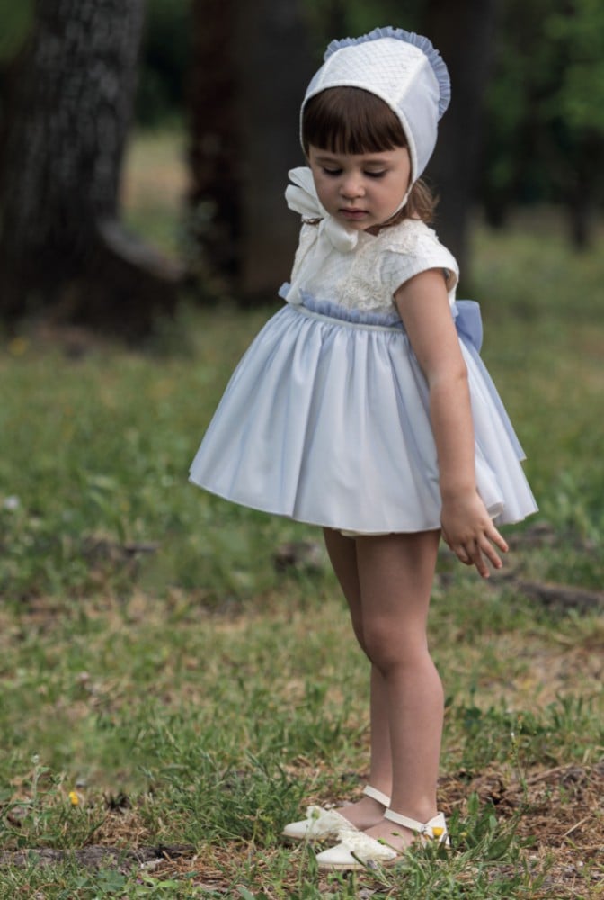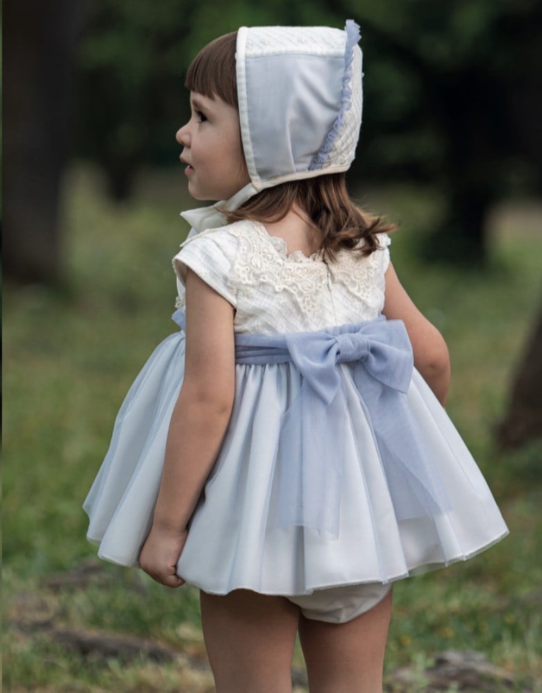 فيستان جميل جدًا للفتيات الصغيرات، طقم فستان باللونين الاوف وايت والأزرق السماوي تم تصميم الصدرية بياقة مربعة وأكمام مغطاة، وتتميز بطبقة من التول المطرز وزخرفة من الدانتيل الرقيق. تحتوي التنورة المجمعة من التول على طبقات سفلية خفيفة الوزن لمزيد من الحجم، وخط خصر مكشكش جميل مع زخرفة مخملية وربطة عنق جميلة على الظهر. يتم ربط الفستان بشكل أنيق بسحاب خلفي مخفي ويكتمل الطقم بملابس داخلية متطابقة فبعة فرنسية تقليدية يتم تثبيتها تحت الذقن بشريط مخملي ناعم.