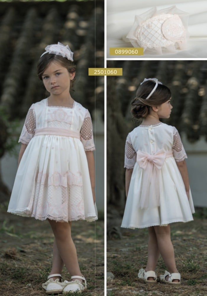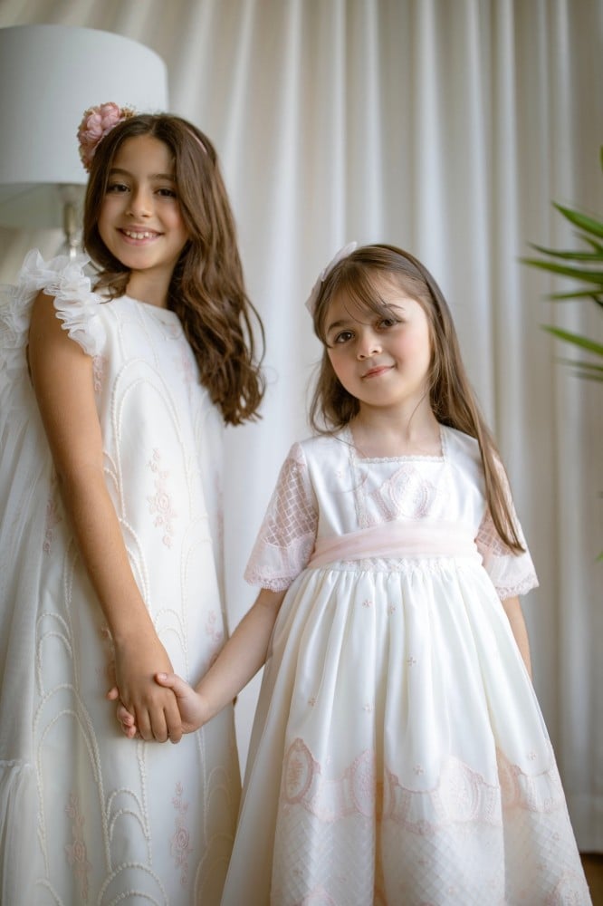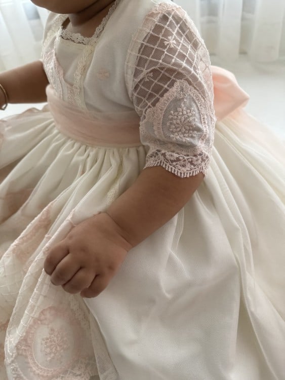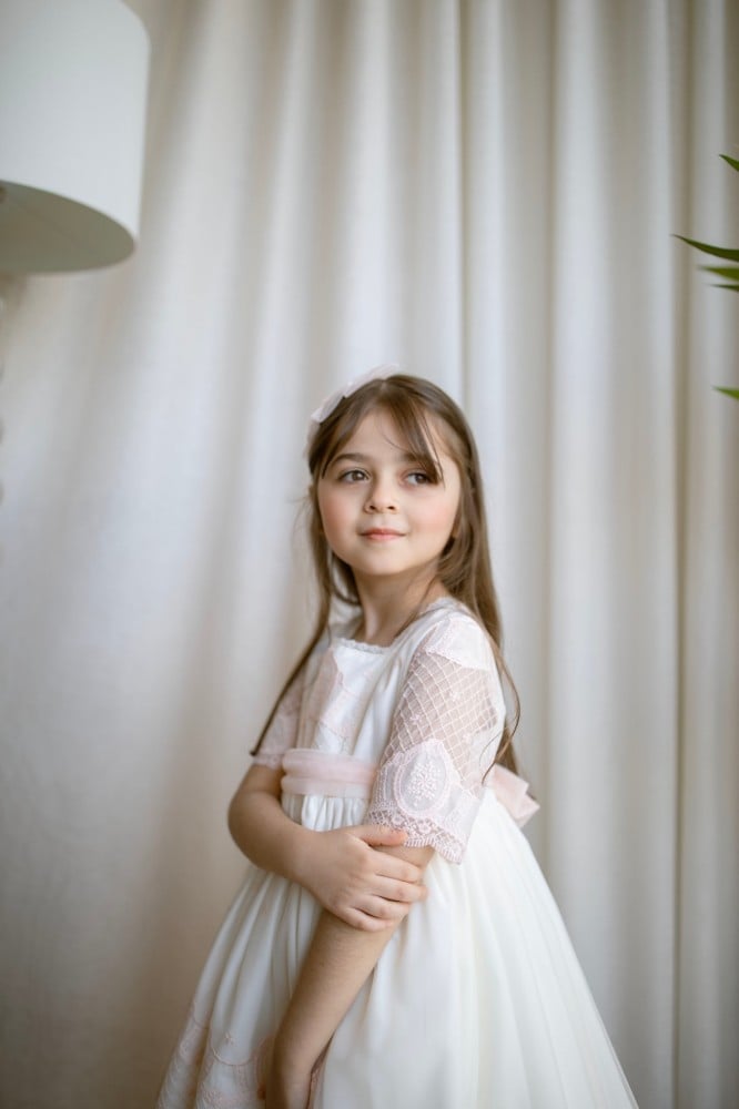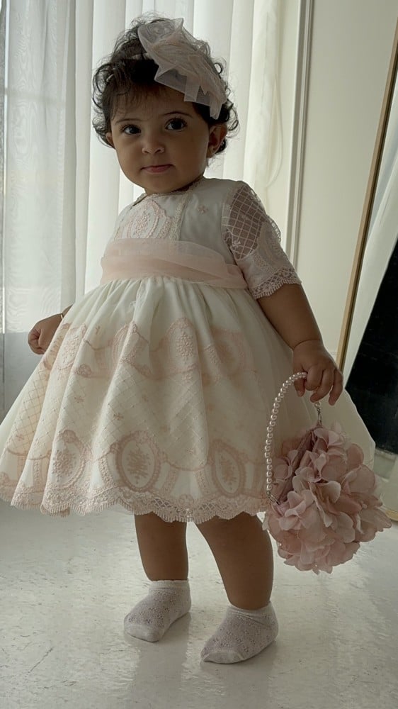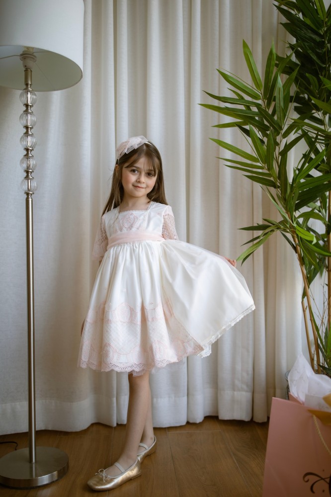 فستان ساحر للمناسبات الخاصة باللونين الاوف وايت والوردي الفاتح للفتيات من عمر سنة إلى ١٢ سنة . مصنوع من مزيج قطني خفيف الوزن، ويتميز بطبقة من التول الاوف وايت مع ألواح من الدانتيل الزهري الوردي وشبكة تول مطرزة على الصدرية والأكمام والتنورة. مع حواف دانتيل زهرية جميلة حول الرقبة والاطراق ، يتم ربط الفستان بحزام من التول الوردي الذي يربط على شكل فيونكة على الظهر، وأزرار الشعار. تتميز البطانة المريحة بكشكشة على الاطراف لمزيد من الحجم.